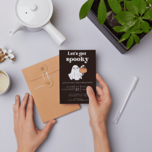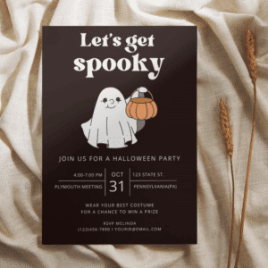 Calling all ghouls and goblins! Prepare to be spooked and delighted with this editable digital Halloween invitation template featuring a cute ghost theme.